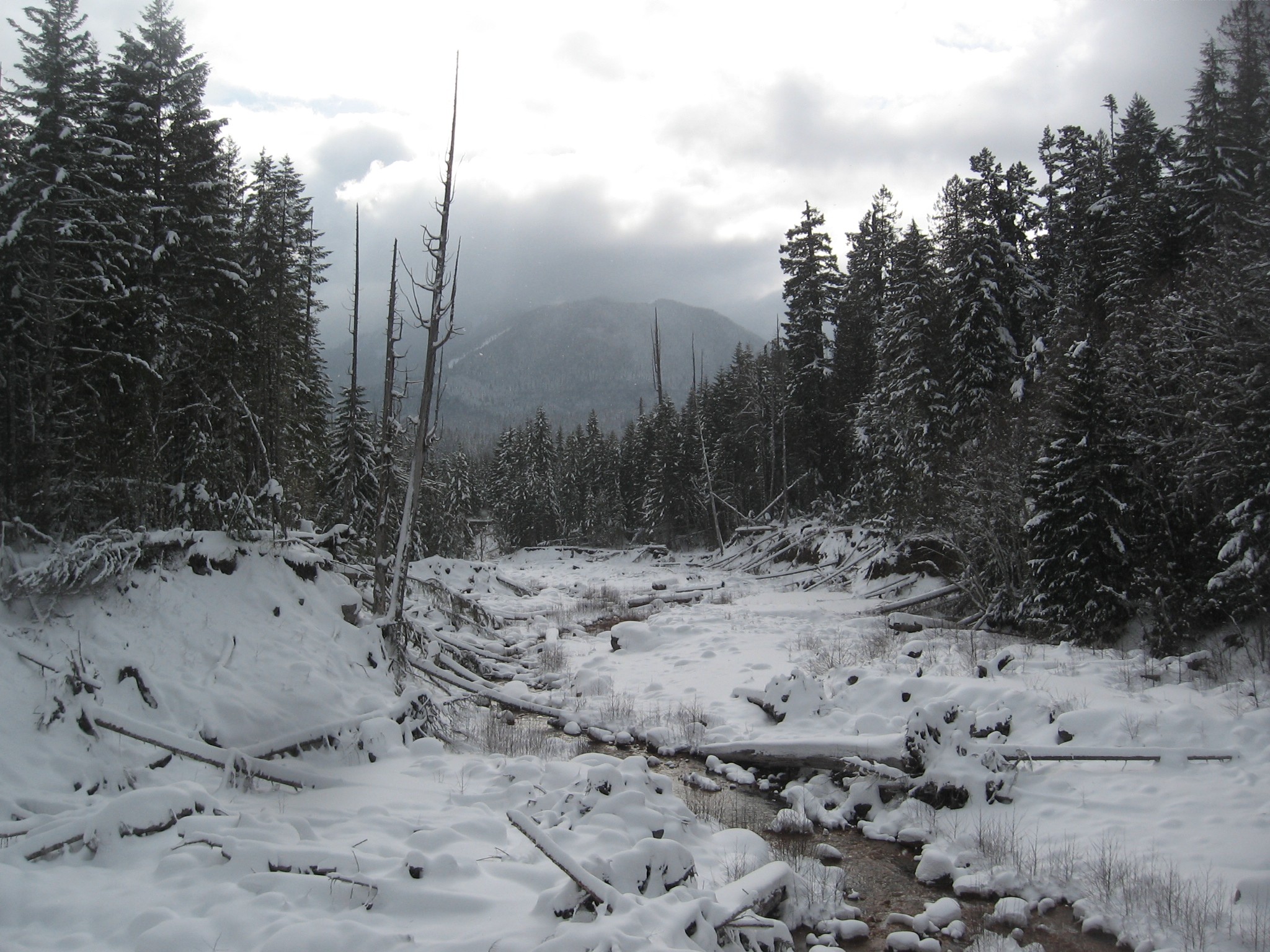 Kautz Creek Trail, about four miles up the mountain from the Nisqually River entrance in Ashford, is an especially ideal trail for snow-shoeing, as it has a gentle slope and mild elevation gain. In addition, the trail is wider than most, which is vital in wintertime as tree branches hang low with snow, or are toppled altogether and force snow-shoers to wiggle, side-step or crawl under the impediments.