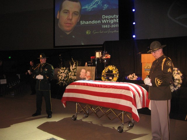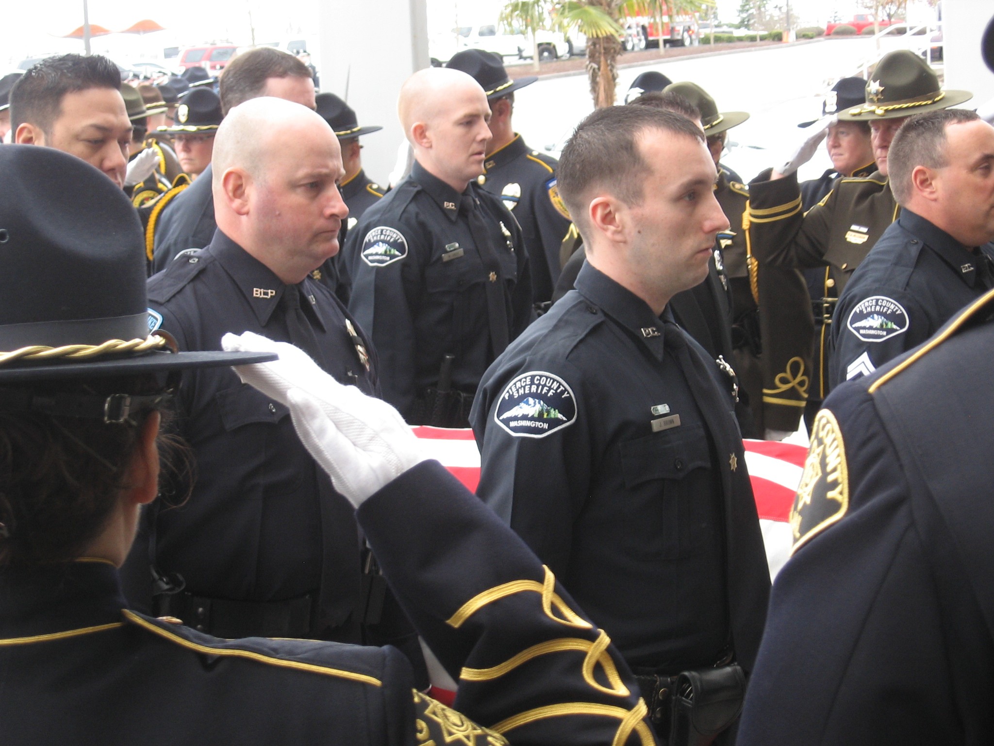 Over 500 police and local firefighters joined with family and friends at the Champions Centre in Tacoma, Friday, to commemorate Pierce County Sheriff’s Deputy Shandon Wright.