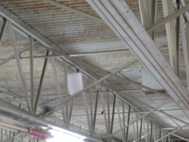 As Poier spoke, three white buckets were visible – lashed to girders overhead to catch rainwater sluicing through the rusty roof above.