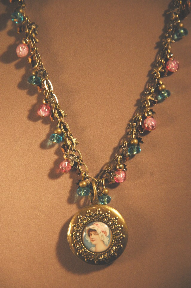 “Even though I like the challenge of working on something new like this, to me, vintage jewelry is the most fun,” Holmes said with admiration, as she pointed to another piece. “This one has pink and blue crystals, bronze fire crystals, and antique gold leaves.”