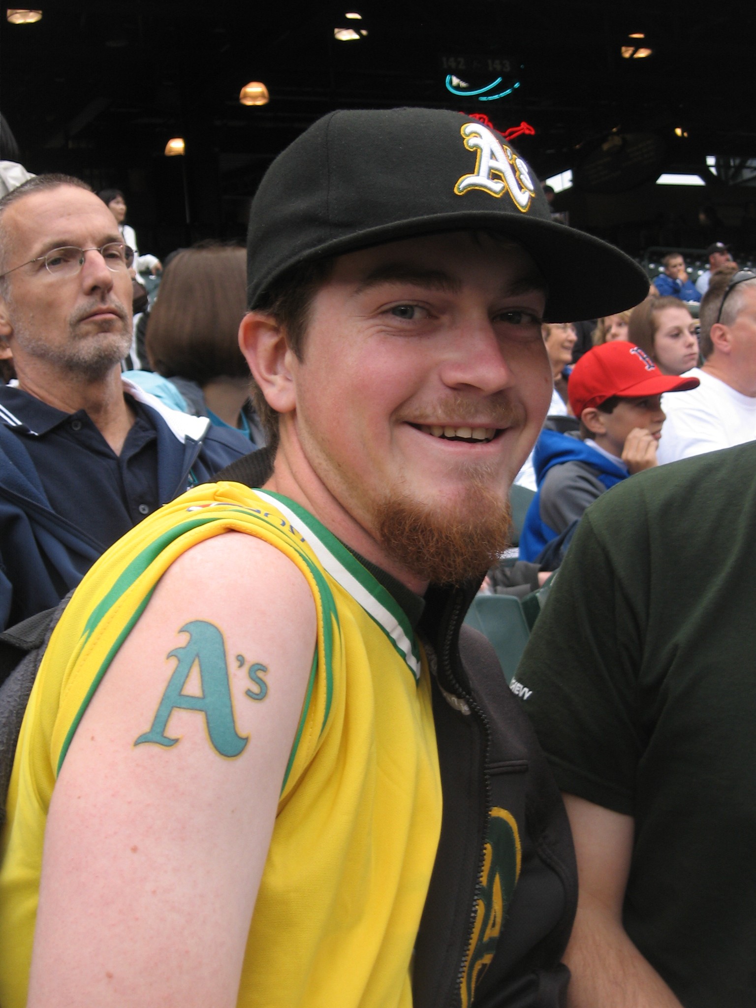 Other fans clutch passionately to their old home town loyalty despite their need to relocate to Seattle. Kevin Dolphay flew into Seattle at 4 am the day of an A’s game, ostensibly to make his interview at the UW law school and tour the campus, but also to catch the evening game. If he makes it to the UW he’ll still be a visible A’s fan, though, as he just got an A’s tattoo on his arm.