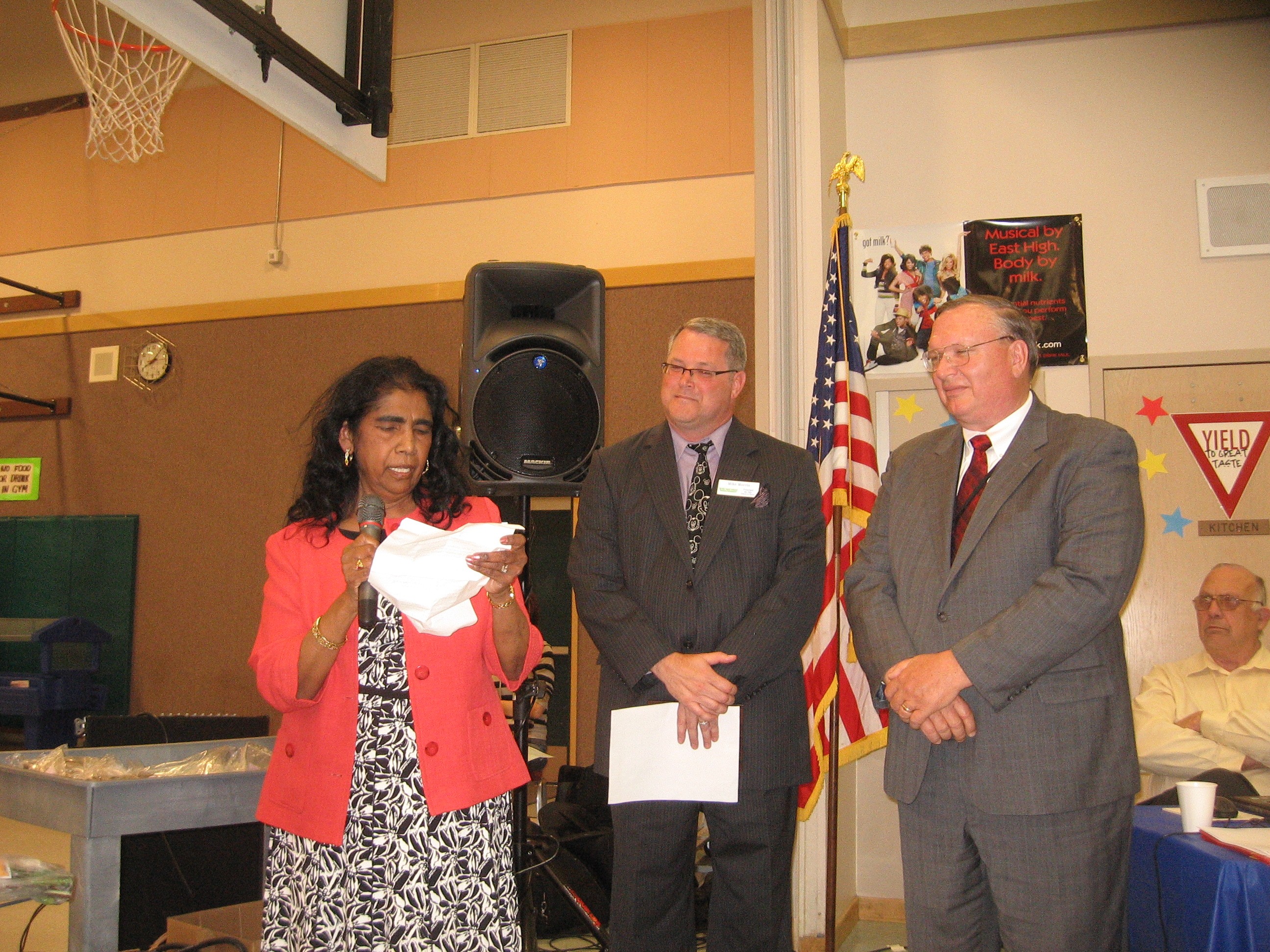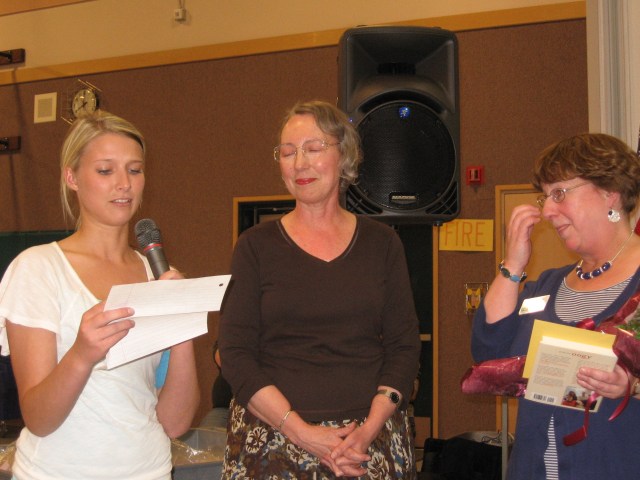 Thirty-five year veteran of Shining Mountain Elementary, Marcia Nanea is honored by one of her former students, Kylie Alexander, who praised her for her inspiring "individualism." Looking on is principal Mary Seawright (r).