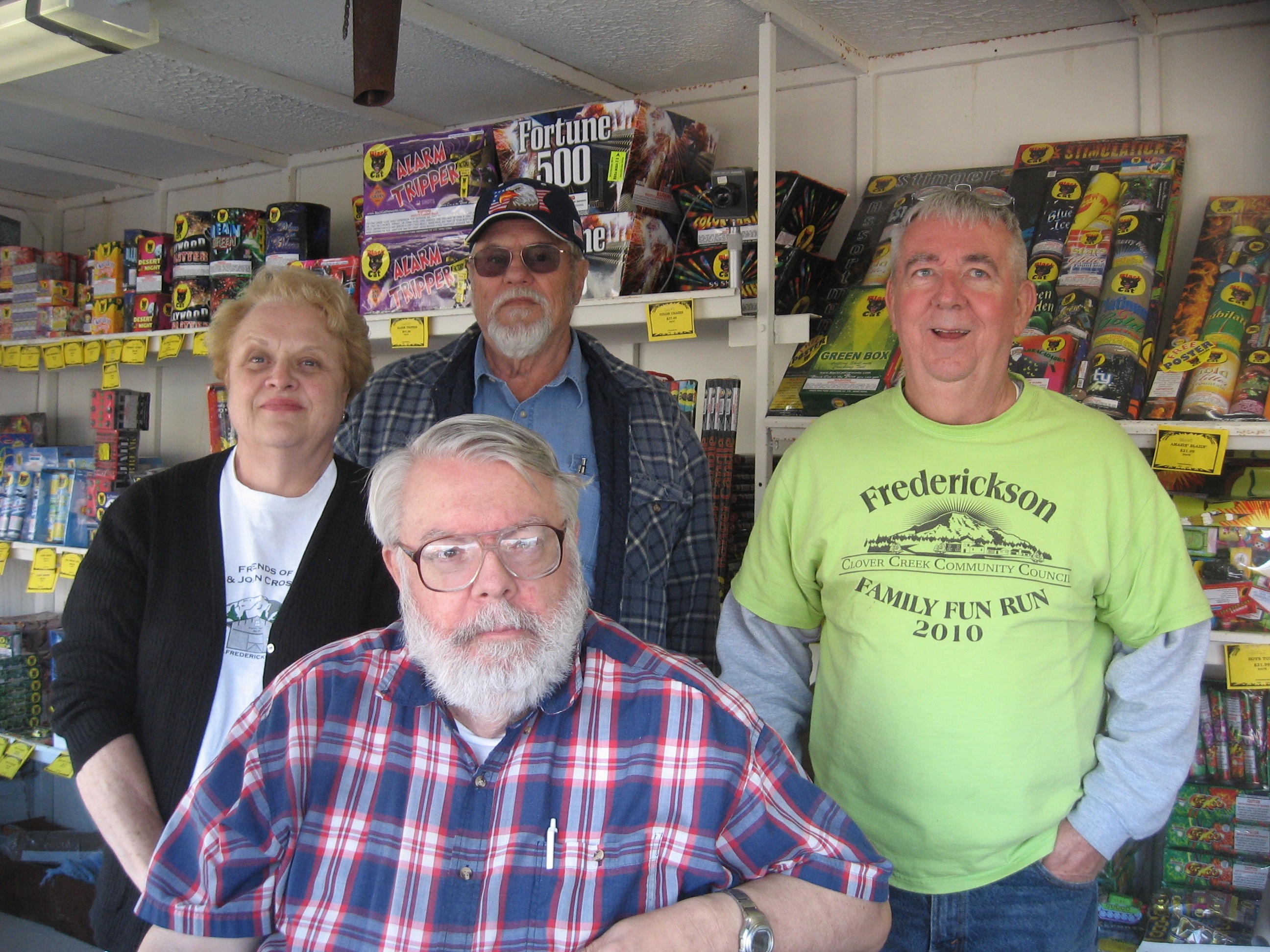 One group is the ever-industrious Friends of Stan and Joan Cross Park (FSJCP). This Frederickson crew obtained a fireworks stand from a local wholesaler, Thunder Fireworks, which is also based in Frederickson. Wholesalers like Thunder, which imports the ubiquitous Black Cat brand of fireworks, provide the trailer or stand, all merchandise, and the location.