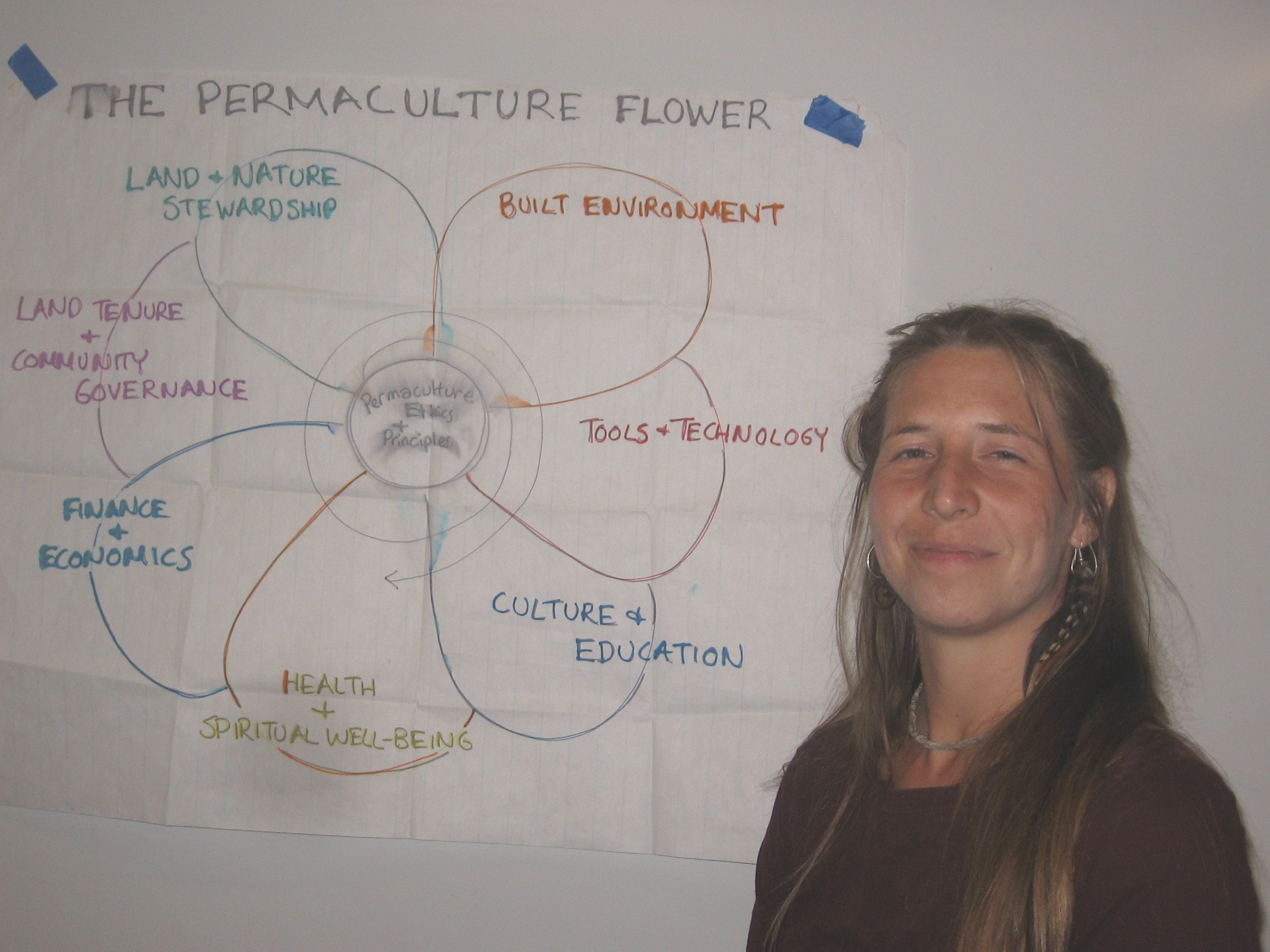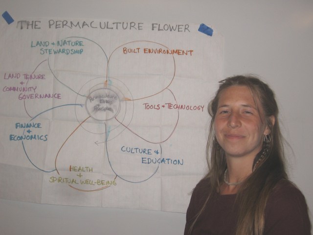 Kelda Miller standing beside her graphic of the permaculture "flower" where each petal describe one of the many aspects of this approach to sustainable living.