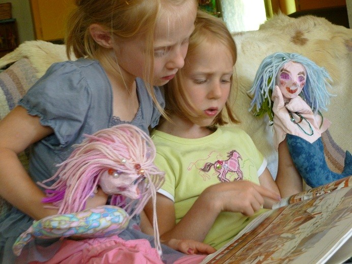Part of the inspiration for this has come from dozens of wonderful library books about our oceans, and the girls love pouring through them.  They’ve become mystified and delighted by seahorses, octopi and other sea creatures, and have learned to draw them quite well.  Now, we are making up a puppet show together – brainstorming, mapping, drawing and singing a story that is loaded with information – all skills they will not forget.  It is all coming from them, so they passionately want to do the book-learning, preparing the big surprise they will share with family and friends.  This is folk art woven into academics, and it works very well.