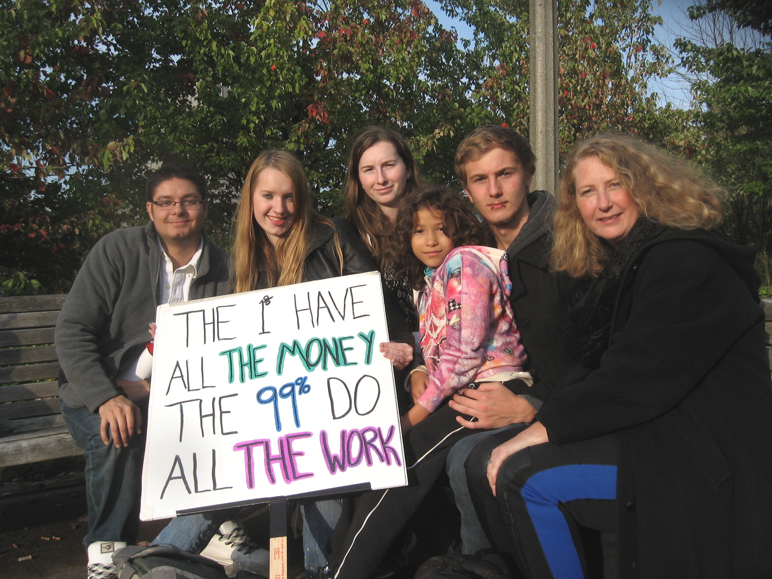 Signs and chants also proclaimed that most of the wealth of the planet is owned by one percent of the population, thus enslaving the remaining ninety-nine percent to a life of poverty. In addition, protesters claim that this concentration of wealth also buys the acquiescence of political and governmental leadership world-wide, thus insuring the dis-empowerment of the “99%-ers.”