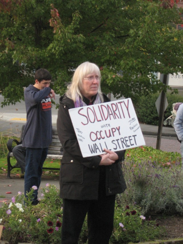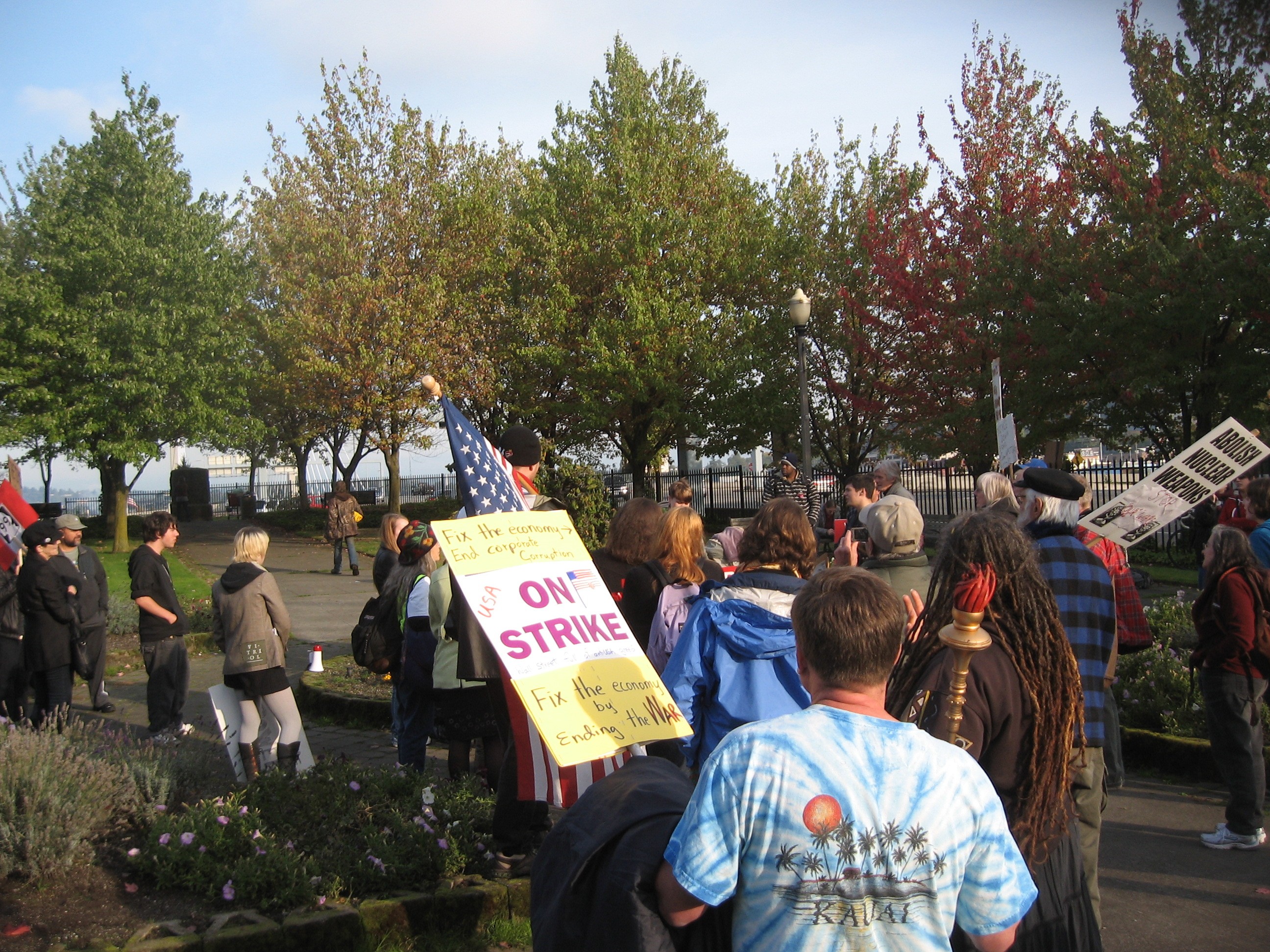 Chanting the mantra that has become the identifying slogan of the so-called Wall Street protest movement, “Banks got the bailouts, we got sold out,” the demonstrators spent the afternoon marching throughout the business district, and then rallied in Tollefson Park for speeches and a live music performance.