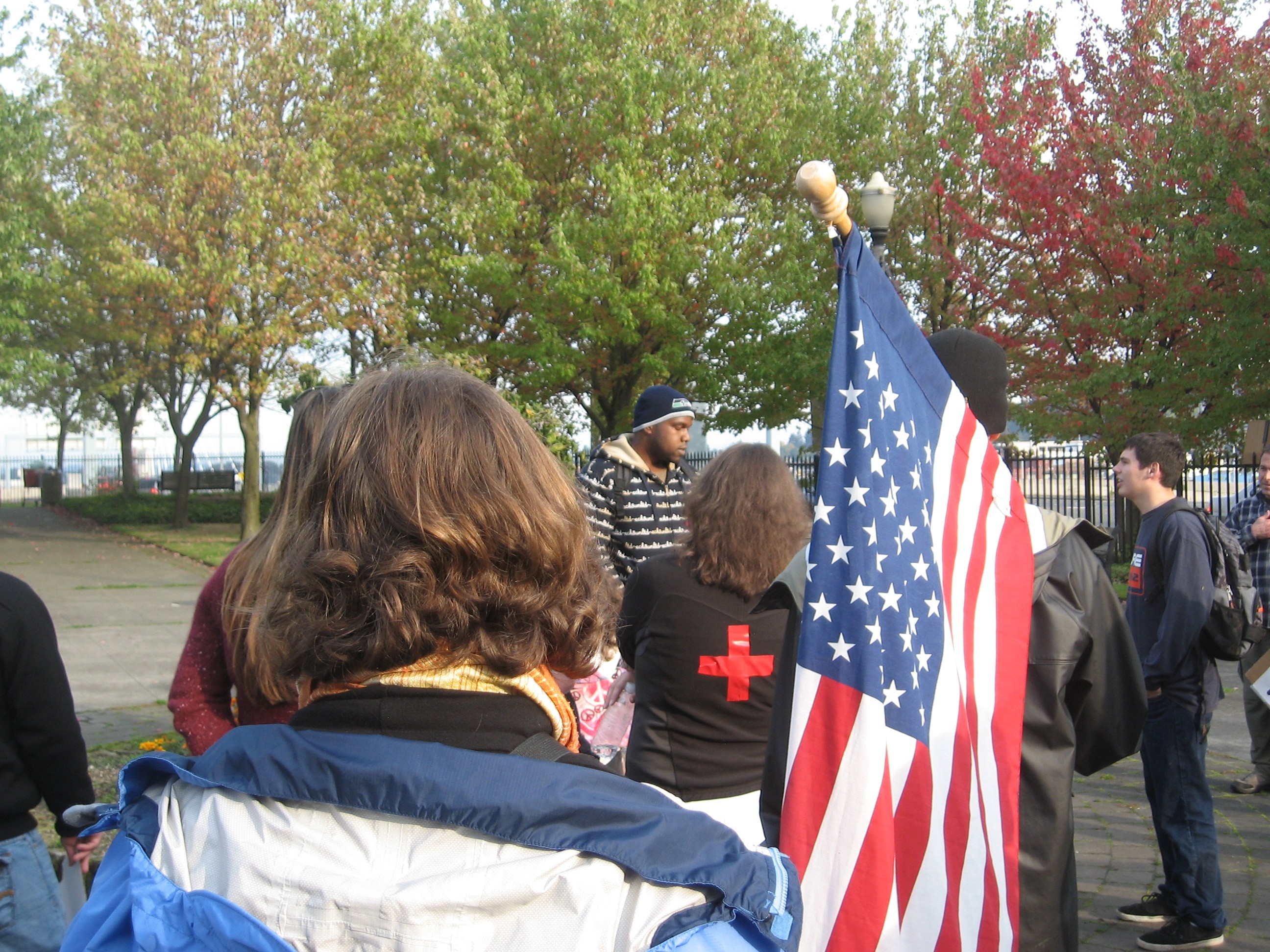 After the main rally, a small group dedicated to an extended ‘round the clock “occupation” relocated to a small park at the corner of Pacific Ave, at the main entrance to I-705 near 21st Street. It’s a parcel that apparently has no official name – at least the protestors couldn’t identify it – but it does have a small monument and plaque commemorating Donald A Pugnetti, and it overlooks the Thea Foss Waterway.