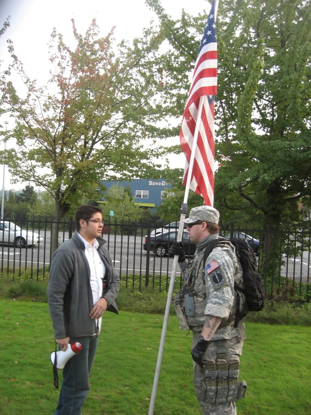 One protestor, Evan Dye, stood off to one side of the crowd, but his presence made a powerful statement. He was dressed in full battle gear – minus an M-16 – and he held an American flag on a long staff. Mr. Dye told the Mountain News that he has served in Iraq from 2009-2010, and that his experiences there and upon his return compelled him to join the protest.