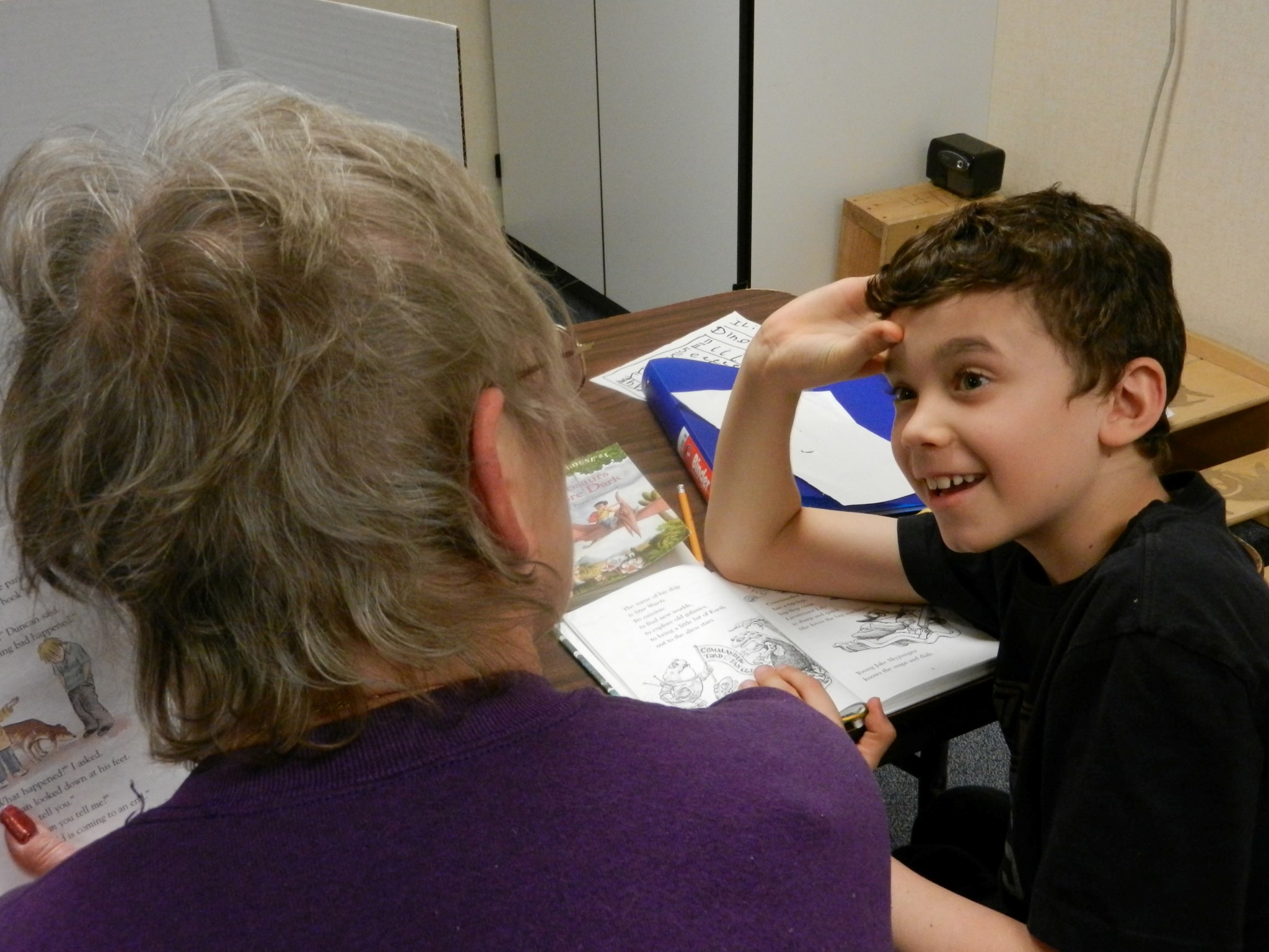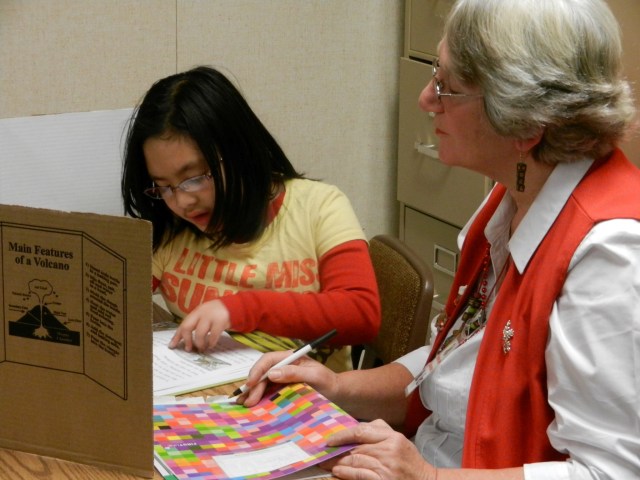 On each table, cardboard “privacy screens” were erected to minimize distractions.  The kids squirmed and wiggled, and then settled down to read.  Their voices hummed as they read out loud to volunteers, who gave them their complete attention.