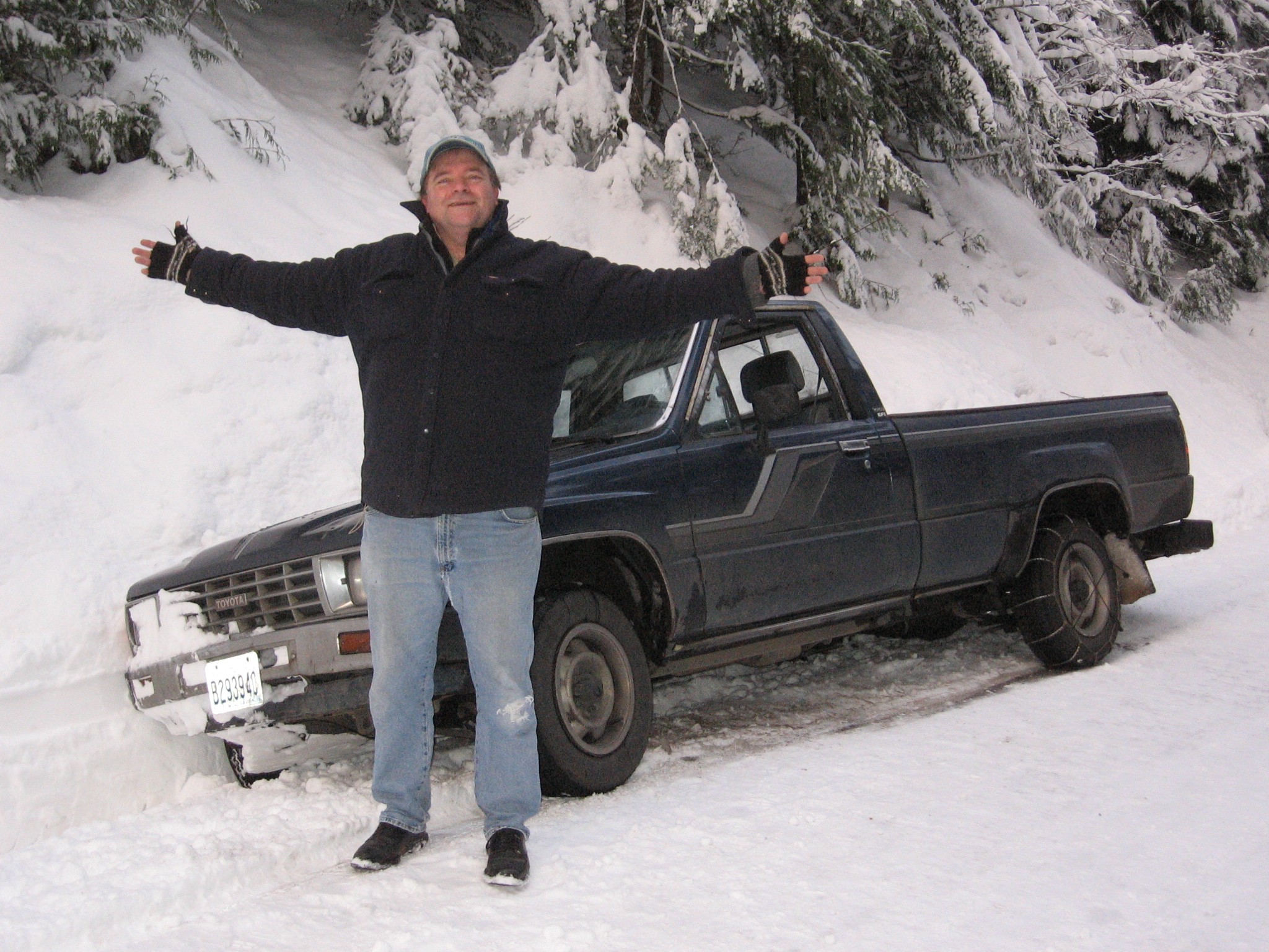 When I ran into the ditch, it was in early December. Down in Eatonville it was a little rainy, but half- way up to Paradise it was all snow and it had been coming down for several days. As a result, two feet of new snow blanketed the ground and trees, and I was so enthralled that I rolled down my window and leaned out and sang Christmas Carols at the top of my lungs as I drove past Longmire and headed to Paradise. Just below Cougar Rock the roadway was very icy and I slid into the dirch coming out of a curve. A car load of tourists descending from Paradise overcompensated to avoid hitting me and they scrapped the snow bank on their side of the road. That spun them and they plunged through the snow bank and dangled precipitously on the edge of the shoulder, with a 50-foot drop underneath their two front wheels. The passengers, college kids from Carnegie-Mellon in Ohio and driving a rental, climbed out the back and were thankful it was not worse. Both vehicles got towed about two hours later, as we had a long wait for Dave from Eatonville Towing. My pick up was pulled out in less than 60 seconds, and the other vehicle was pretty tricky and took much longer. I was in the ditch just enough to prevent me from backing out with my chains.