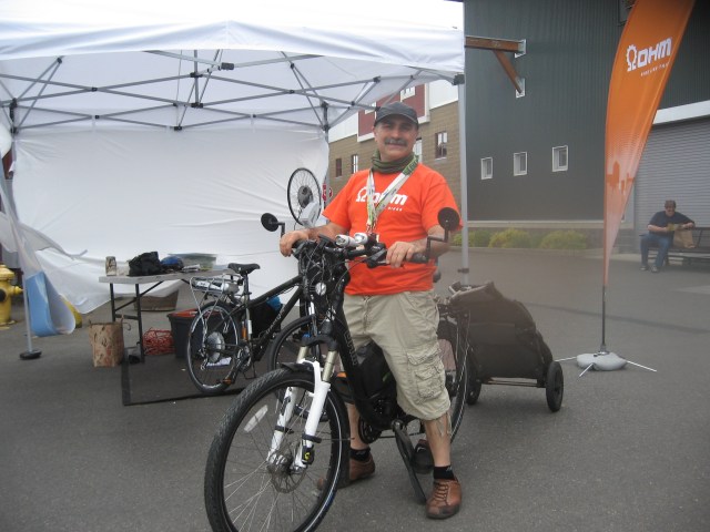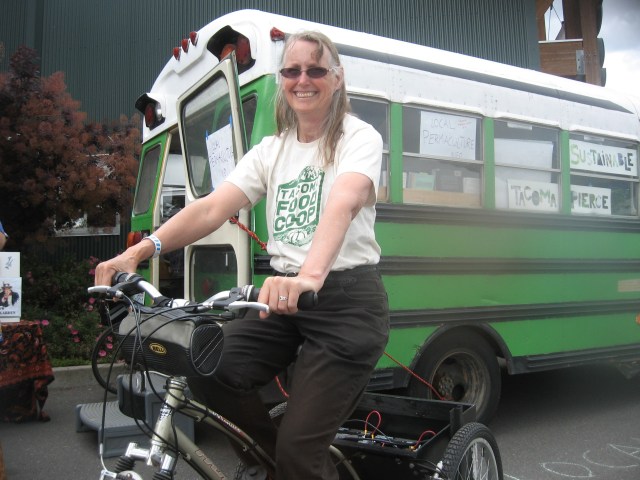 Patricia Menzies of Sustainable Tacoma-Pierce County astride her electric trike, posing in front of her nationwide touring bus filled with literature on sustainability.