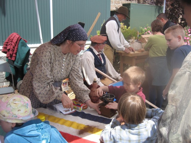 Re-enactors from the Fort Nisqually Historical Museum ginding coffee the old-fashioned way with kids.